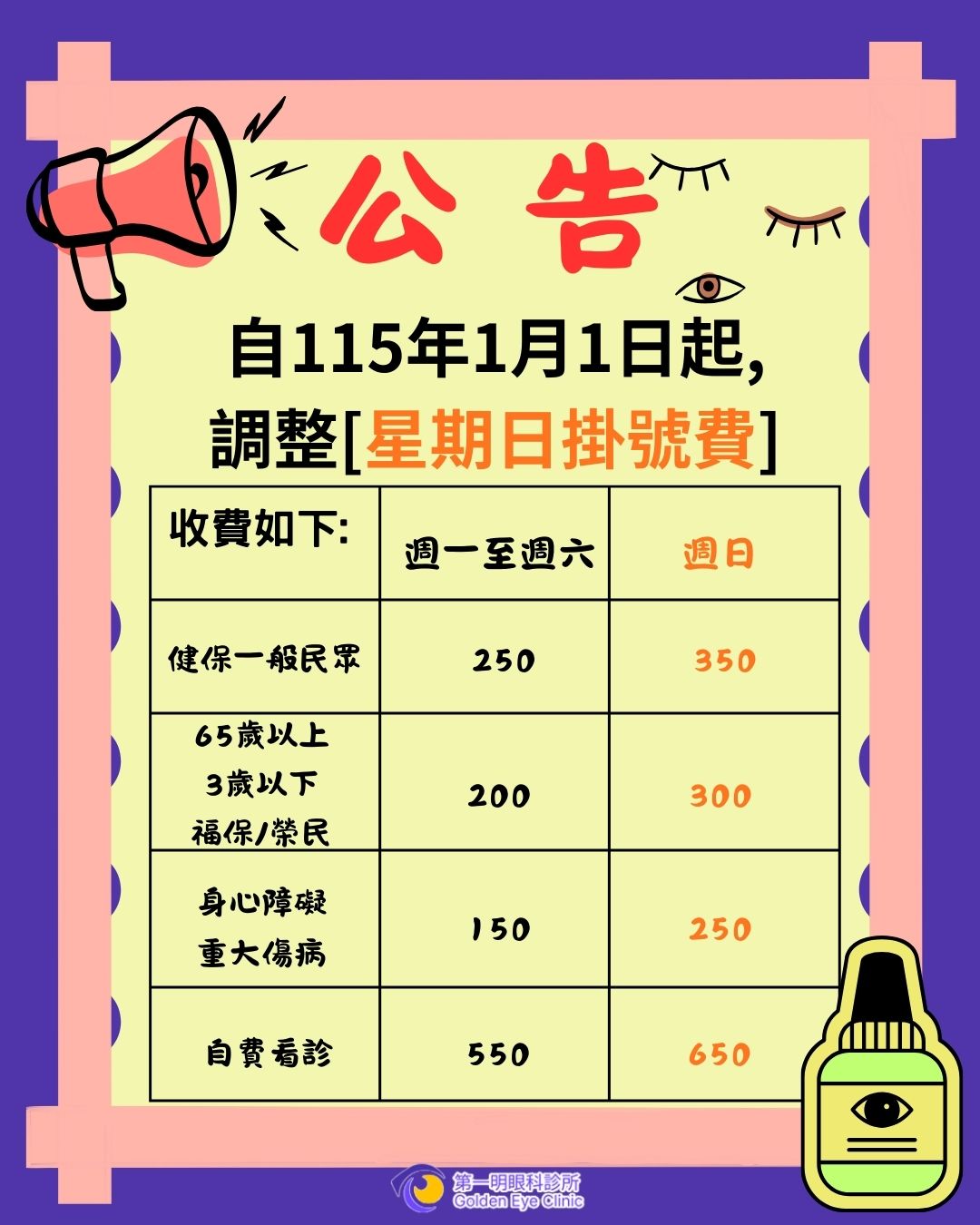 本診所自115年1月1日起,調整[星期日門診掛號費],調整後收費如圖(含部分負擔)。